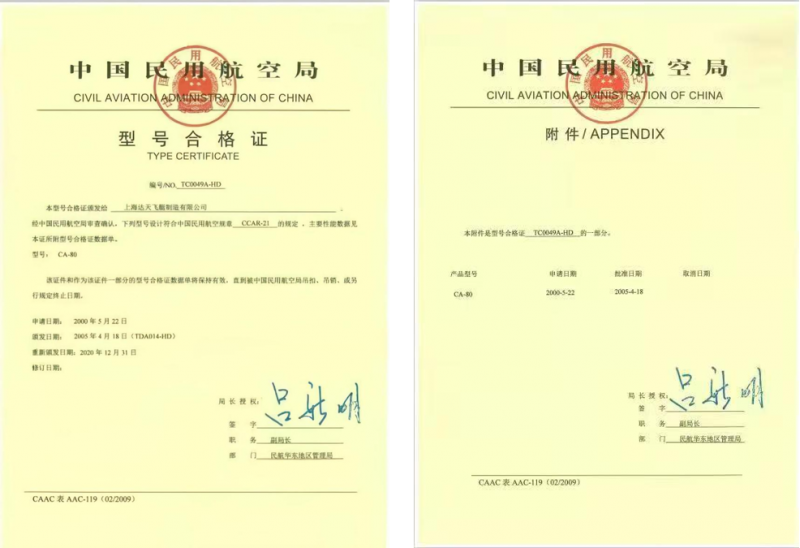 上海达天飞艇制造有限公司研制的CA-80型飞艇于2020年12月31日正式获得中国民航局颁发的《型号合格证》,其前身为2005年4月18日取得的《型号设计批准书》。CA-80型飞艇是国内首个具备完全自主知识产权的软式载人飞艇,实现了载人飞艇领域取代进口的历史性突破;该飞艇根据《AOPA中国航空纪录认证》团体标准,获得“中国首个获民航局颁发型号合格证的载人飞艇”认证。