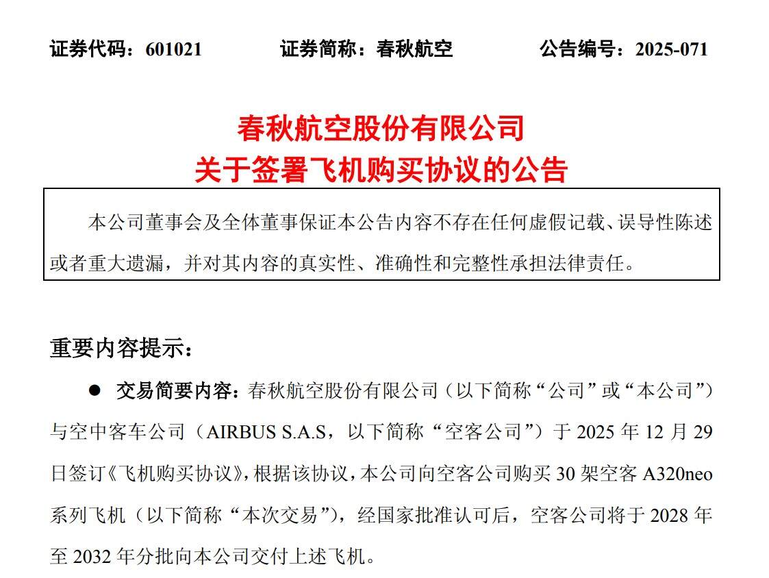 12月29日,春秋航空与吉祥航空分别发布公告,宣布拟向空中客车公司采购A320系列飞机。据公告,两家航司订单合计55架客机、交易金额超82亿美元(约人民币574.48亿元),交付周期集中在2028年至2032年。