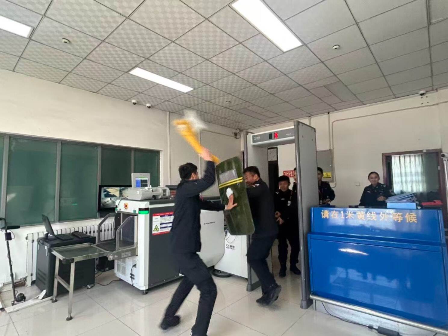 此次演练以模拟人员冲击安检区域为场景,全程紧贴工作实际。演练中,一线安检员第一时间发现险情,迅速发出预警并启动应急预案。各岗位人员闻令而动、分工明确,快速完成旅客疏散、现场警戒、规范处置等环节,动作娴熟、配合默契、处置高效,充分展现出训练有素、临危不乱的专业素养。整个演练流程衔接顺畅、组织严密,达到了以练备战、以练提能的良好效果。
