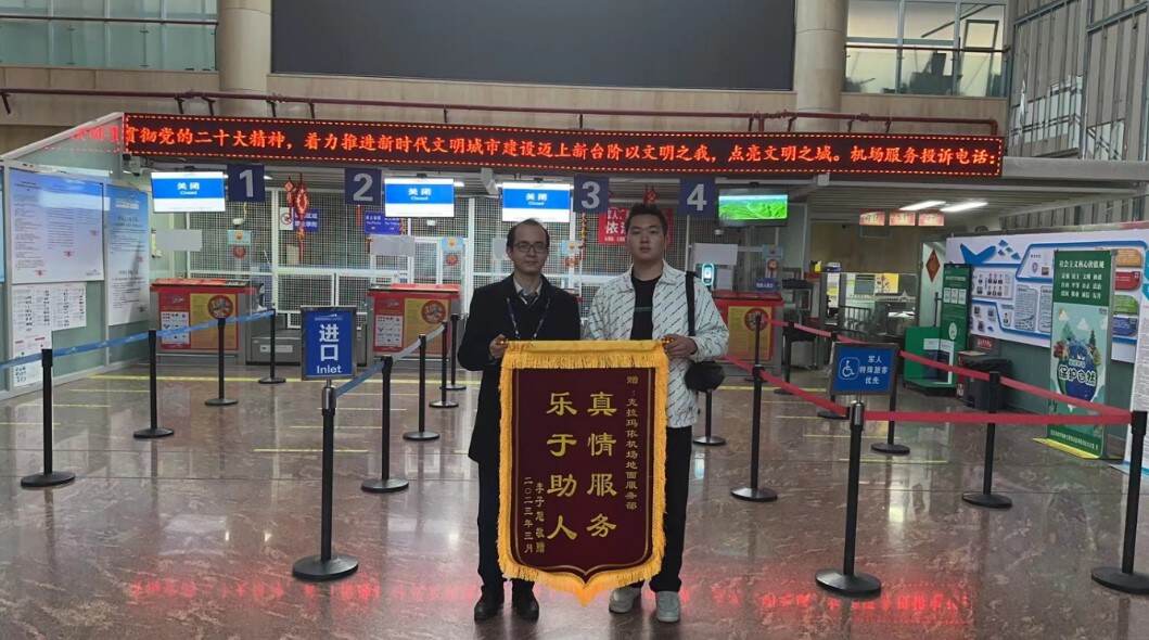 今日,李先生考试完毕返回克拉玛依,下飞机后将一面印有“真情服务,乐于助人”的锦旗送给了克拉玛依机场地面服务部以表感谢。