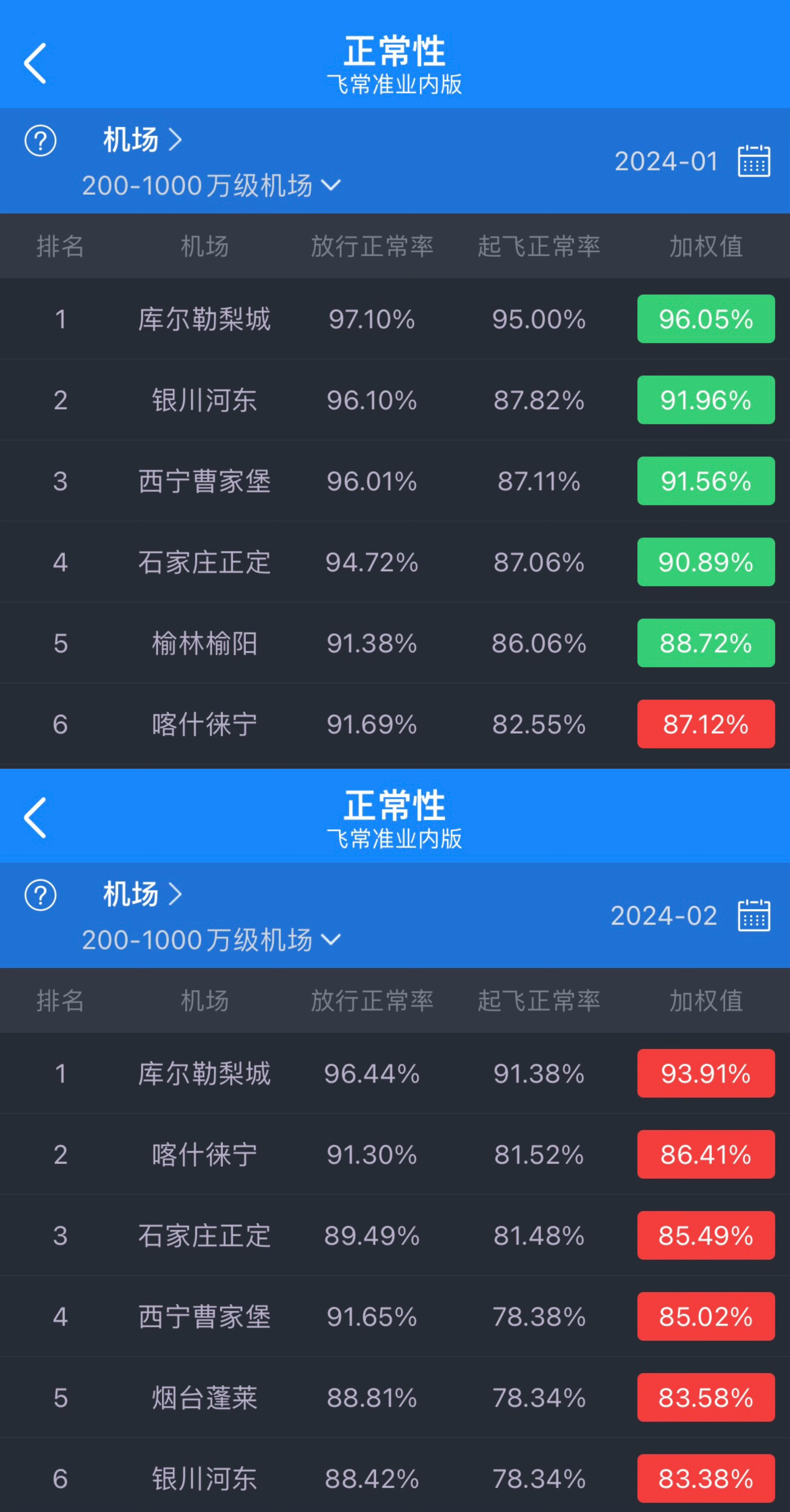 2024开年以来,库尔勒梨城机场共保障航班3966架次,单日保障高达81架次,1-2月航班正常率取得94.98%的好成绩,高于第二名6.7个百分点,同比2023年提升了9.5个百分点,在全国200—1000万级机场排名位居第一位。