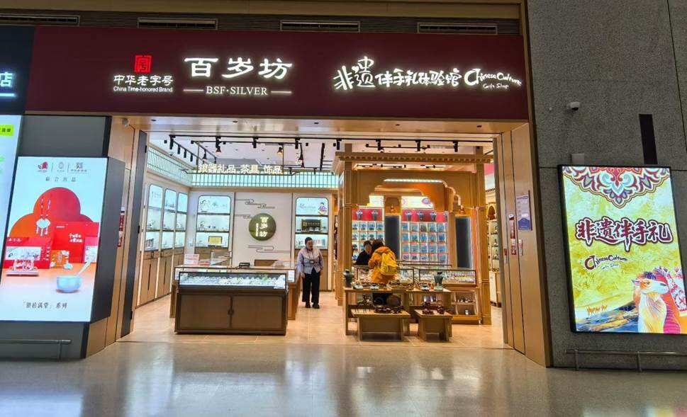 “让每一位旅客在方寸之间感受中华非遗的多元魅力是我们深切的愿景。”店铺负责人这样讲到。店面设计巧妙融合新国风与新疆传统建筑元素,在航站楼内打造出沉浸式文化体验空间。店铺展示出大量百岁坊传承80余年的非遗银艺代表作——如憨态可掬的【巳巳如意】灵蛇系列、寓意百福百顺的手工錾刻百福餐具,以及承载成长祝福的平安喜乐宝宝套系等专利产品;更集结了喀什铜器、艾德莱斯等新疆本地的非遗,全面覆盖旅游纪念、商务馈赠、日常实用等场景,让文化消费更具仪式感与便捷性。让候机时光成为非遗文化体验之旅。