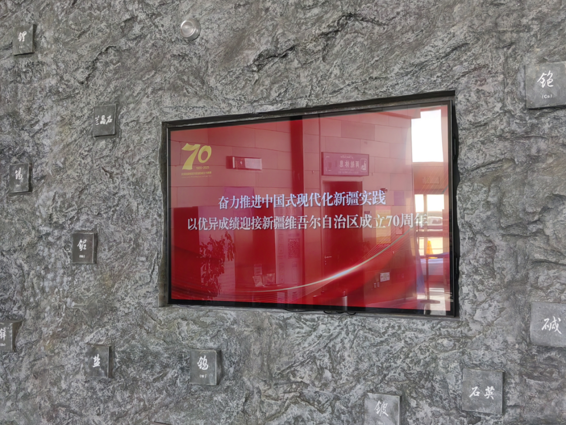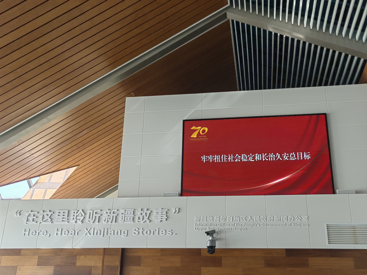 机场航站楼内外焕然一新,候机大厅内,LED屏滚动播放着"庆祝新疆维吾尔自治区成立70周年"宣传标语和专题纪录片,展现新疆70年来的沧桑巨变。