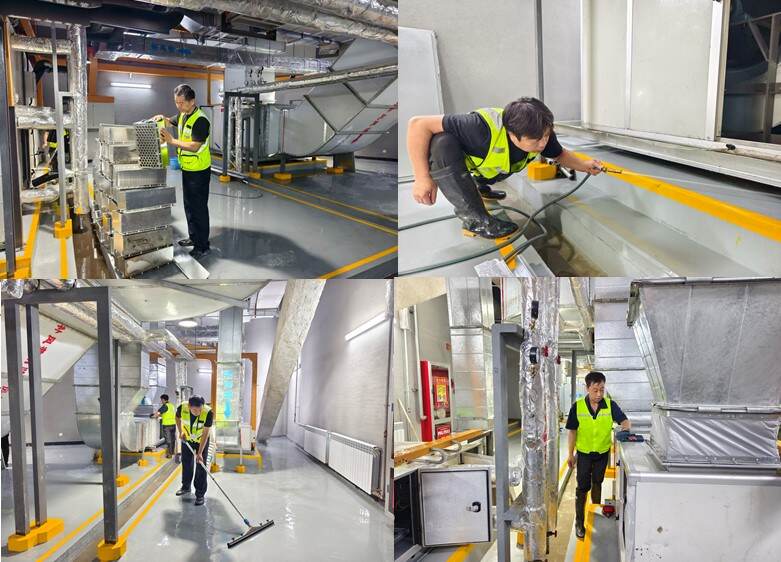 在作业现场,保洁人员身着醒目的反光背心,严格按照标准化操作作业流程,有序的开展各项工作。本次清洁作业制定了“分区作业、标准清洗、全程监管”的实施方案。对机房内空调机组、新风管道、回风滤网等进行清洗,同时运用高压水枪冲洗、专用清洁剂擦拭等方式,全面清除设备表面积累的灰尘、油污和杂物。面对部分空间狭小、设备密集的区域,保洁人员同样耐心细致地进行清洁,不遗漏任何一个角落,确保清洁无死角。