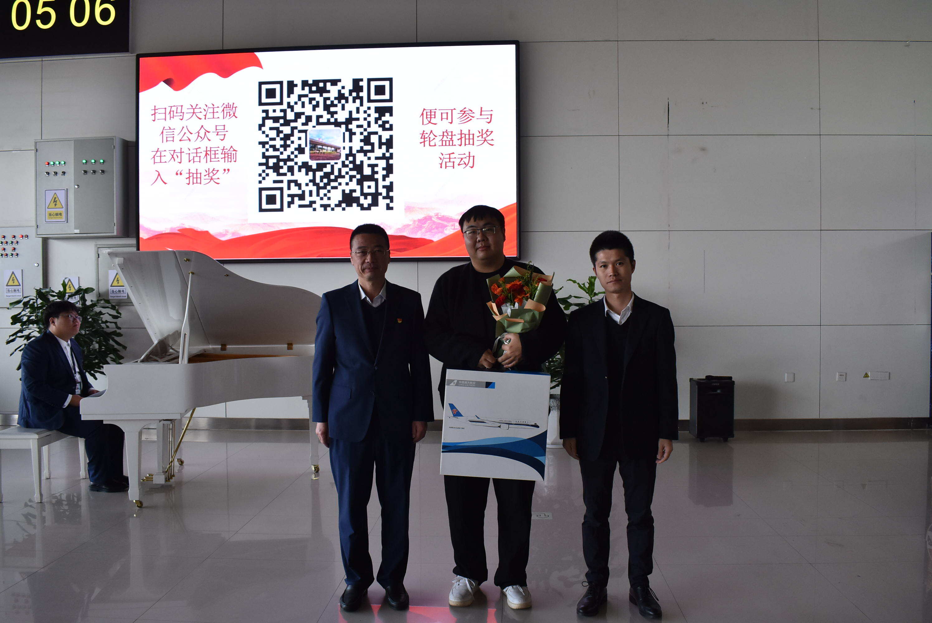 在庆祝活动上,伊犁伊宁国际机场领导及航空公司代表共同向第300万名等幸运旅客赠送免费机票及鲜花并合影留念,并组织现场参加活动的旅客,关注伊犁伊宁国际机场公众号参加“幸运抽奖活动”,将现场气氛推向高潮。
