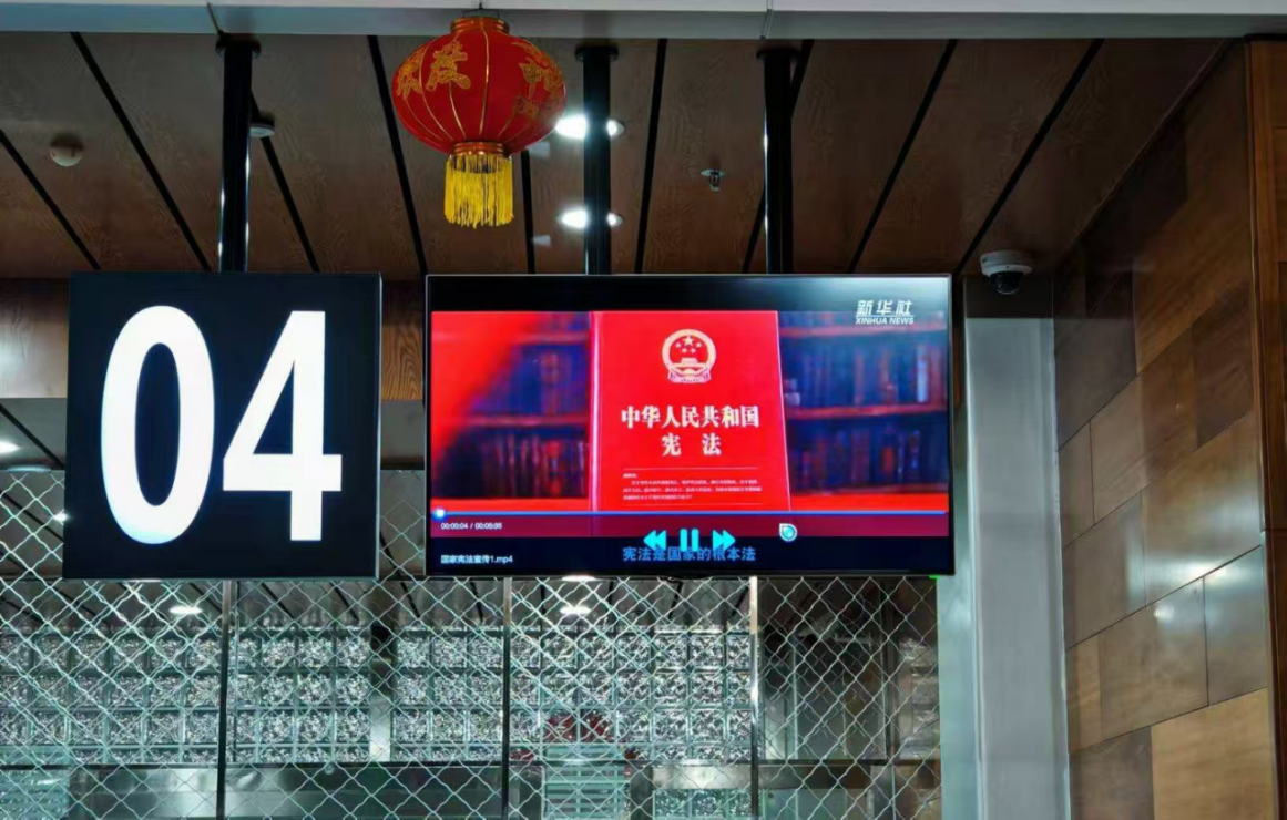 立足旅客需求,打造沉浸式普法场景。航站楼内,LED大屏与值机柜台电视同步滚动播放宪法宣传短片及标语。