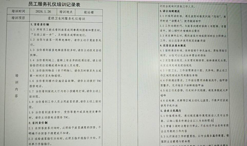 本次培训紧扣航站楼服务标准与旅客实际需求,采用“理论讲解+现场实操”模式,确保培训内容入脑入心、落地见效,围绕星级卫生间服务核心要求,系统讲解了仪容仪表规范、站姿坐姿礼仪、文明用语使用等基础内容,明确要求保洁人员统一着装、佩戴工牌,保持仪容整洁得体,在岗期间使用“您好”“请您稍等”“感谢配合”等文明用语,以亲和态度回应旅客需求,针对卫生间服务的高频场景,重点讲解了旅客高峰期的服务技巧、特殊旅客(老人、儿童、残障人士)的帮扶礼仪、突发情况(如设施故障、旅客物品遗失)的处置规范等,现场实操环节中,示范了卫生间清洁时的避让礼仪、主动为旅客指引的手势规范等细节动作,确保每位员工熟练掌握服务要领。