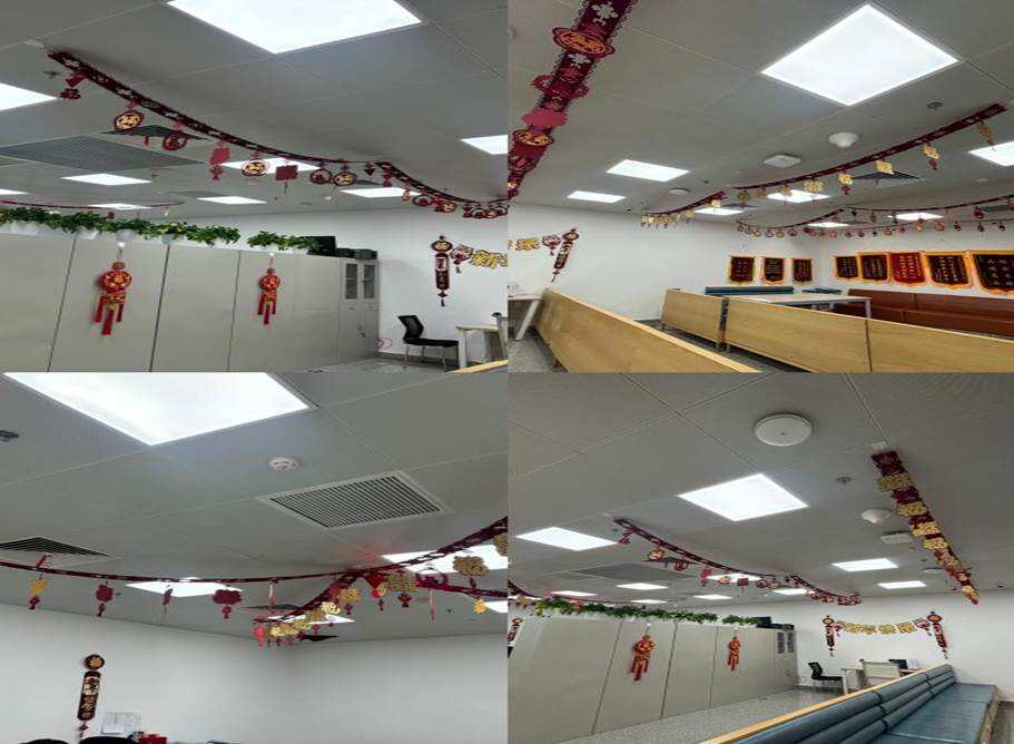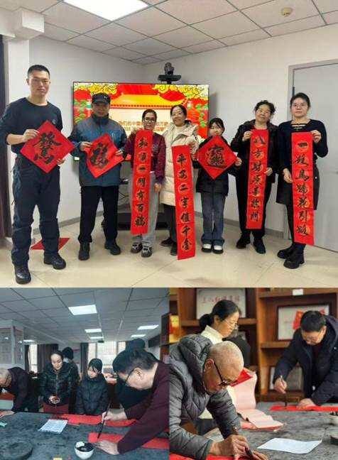 在氛围营造方面,各小区及项目点因地制宜,精心布置。昌吉小区在喷泉处、主干道及凉亭等区域设置彩灯彩带、灯笼及“新年快乐”发光字,并张贴安全提示;五一小区在主干道、景观池及出入口布置彩灯、灯笼及发光字,营造浓厚节日气息;南昌路小区、机场小区、库车天缘嘉福小区等地也通过悬挂灯笼、彩带、装饰花灯等形式,装点出浓浓年味。伊宁写字楼、商飞项目则通过中国结、刺绣花灯、拉花装饰等元素,营造温馨舒适的办公环境,机场小区项目部联合天山社区举办写对联活动,给广大业主送去暖心的美好祝福。