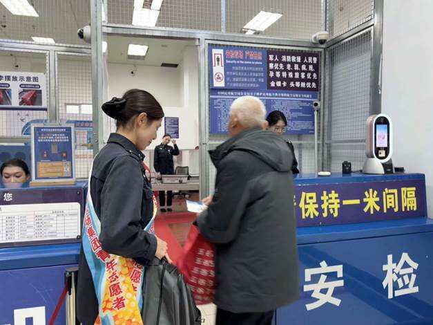 针对返程旅客行李多、特殊群体出行不便等特点,安检站启动高峰保障模式,科学调配人力,动态优化安检通道。安检志愿者主动延伸服务触角,在待检区、安检口等关键点位,为携带重物的旅客提拿行李,为行动不便的老人、轮椅旅客提供“一对一”全流程帮扶,从证件查验、行李过机到引导登机,全程贴心陪护。