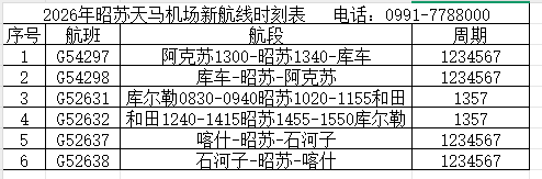 在新增干线航线的同时,昭苏天马机场同步优化疆内环飞航班计划,加密阿克苏、库车、库尔勒、和田、石河子、喀什等疆内重点城市的航班频次。根据最新航班时刻表,加密航班涵盖G54297、G54298、G52631等多个航班号,时刻量配置科学精准,每日分时段布局往返航班,形成“早中晚”全覆盖的出行时段选择。其中,前往阿克苏、库车、喀什等热门航点的航班时刻量充足,前往库尔勒、和田的航班亦完成运力补充,实现了疆内主要城市的高效串联,真正打通了昭苏与全疆各地的“空中便民路”。