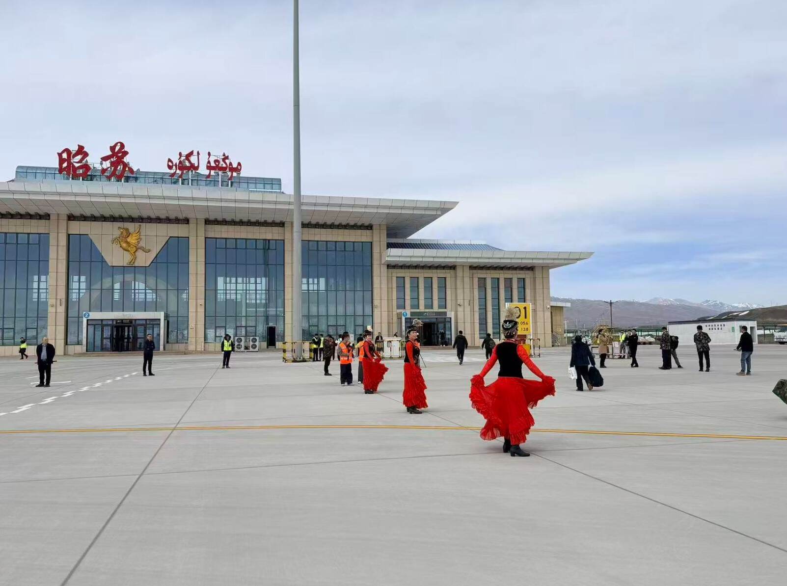 停机坪上,身着民族服饰的工作人员与机场运营团队、航司机组人员共同合影留念,红色的首航庆祝横幅格外醒目,彰显着三地互联互通的喜悦与期待。昭苏天马机场航站楼前,旅客们有序走出机场,民族风情表演与热烈的欢迎氛围交织,让首批抵达的旅客沉浸式感受昭苏的独特魅力。