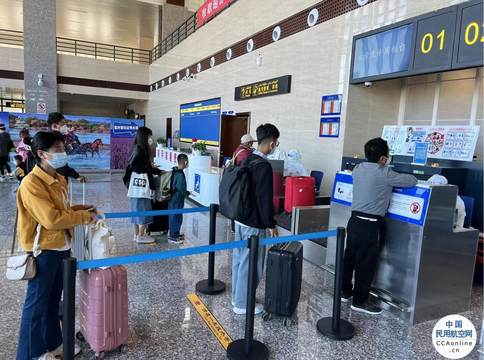 中国民用航空网讯(通讯员 王佳琦)临近开学季,昭苏机场迎来了各大高校学生返校客流小高峰。在当前疫情防控的关键时期,昭苏机场将保障好莘莘学子顺利乘机返校作为一项重要工作,并为学生开通绿色专用柜台,多举措助力高校学子返校,为广大学子提供平安顺畅的出行体验。 昭苏机场为大学生返校提前明确各岗位工作职责,为共同做好学生返校工作,明确各岗位工作人员在学生到机场后,志愿者着二级防护,组织学生不聚集,不扎堆,保持间隔排队,有序进入航站楼,再由志愿者将大学生引导至专用值机柜台快速办理乘机手续,进入隔离厅等待登机。