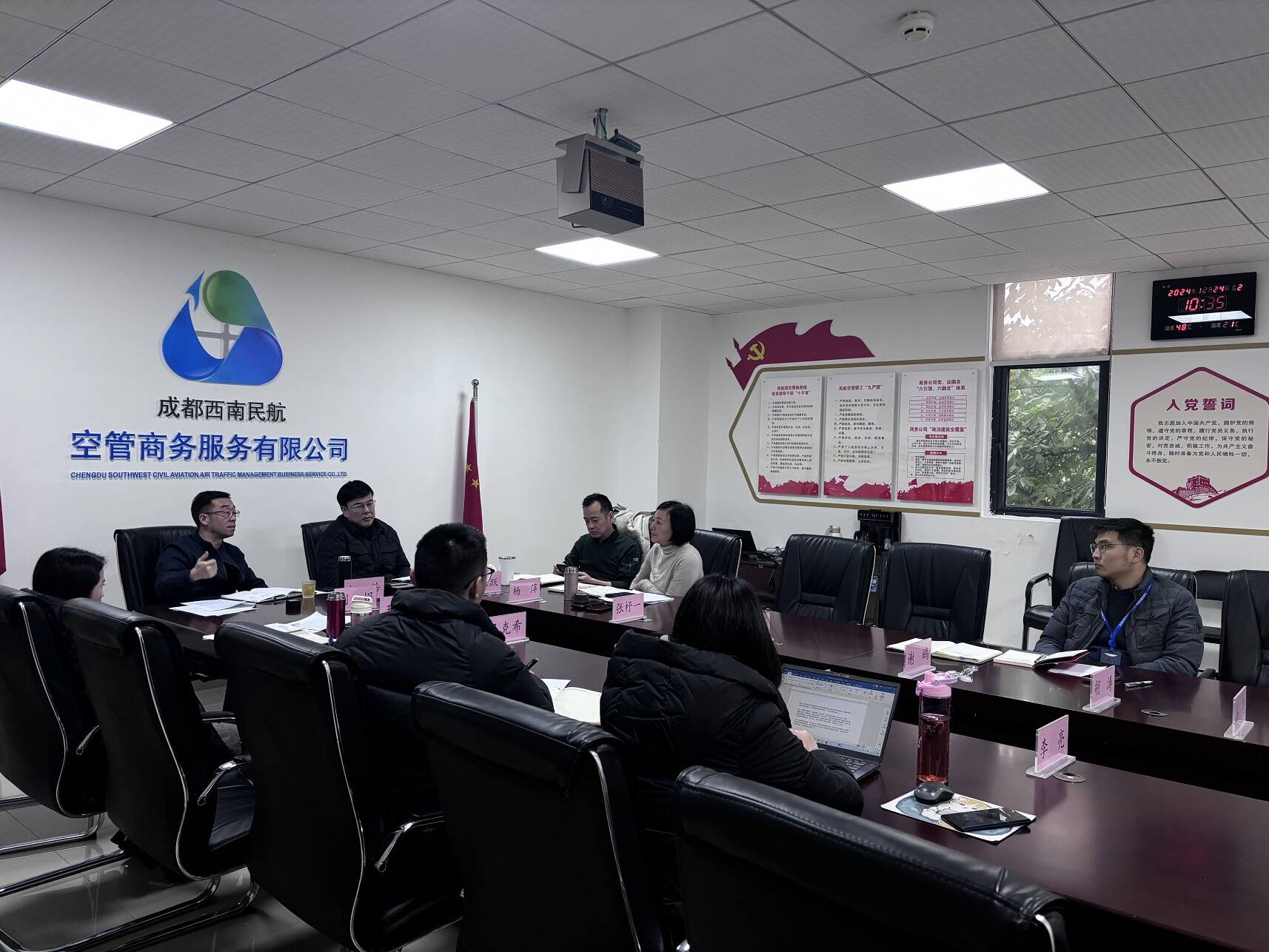 2024年12月24日,西南空管局商务公司党委以中心组研讨的形式召开2025年工作务虚会,深入学习贯彻党的二十届三中全会精神,统筹谋划2025年重点工作思路、主要目标和关键举措。公司党委书记江浩主持会议。公司领导班子成员,董事会秘书、综合部相关助理参加会议。