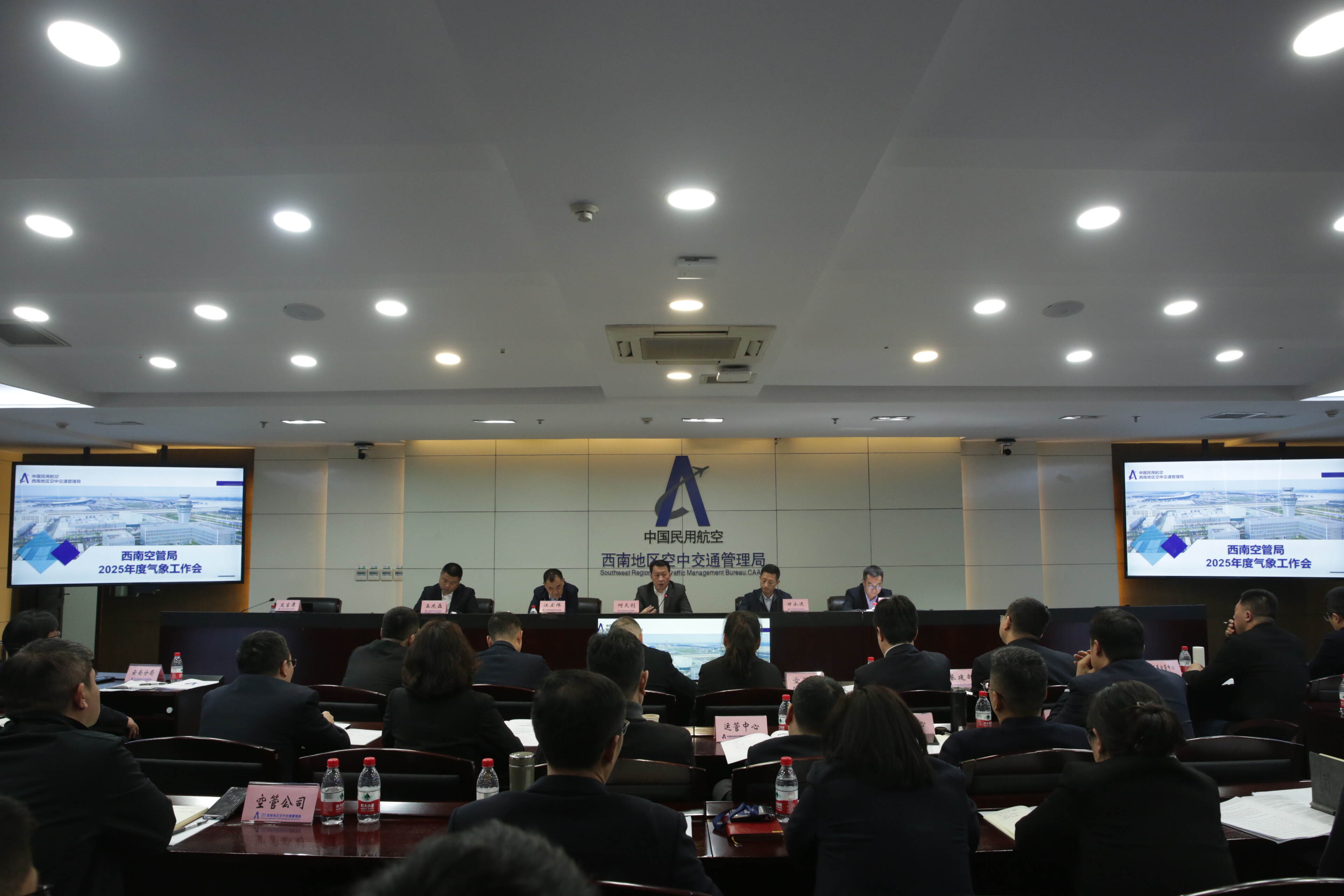 为总结回顾2024年西南空管局气象工作,推动2025年气象重点工作落实,3月12日,西南空管局召开2025年度气象工作会议。西南空管局局长何天剑、副局长汪宏伟,办公室、战略部、安全部、空管部、通导部、气象部、基建部、运管中心、空管中心、气象中心、培训中心、建设指挥部、天府空管办、空管公司、各空管分局领导及代表出席了本次会议。会议邀请了民航四川监管局空管处处长甘永进莅临指导,同时邀请了西藏空管中心、中国民航飞行学院、四川省机场集团、云南机场集团的领导和代表参加。