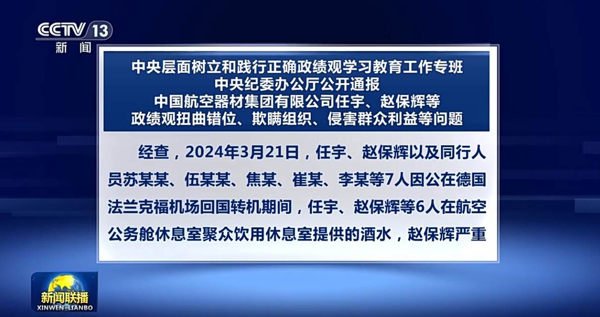 日前,中央层面树立和践行正确政绩观学习教育工作专班、中央纪委办公厅公开通报中国航空器材集团有限公司(以下简称中国航材)原董事长、党委书记任宇,原总会计师、党委委员赵保辉等政绩观扭曲错位、欺瞒组织、侵害群众利益等问题。 经查,2024年3月21日,任宇、赵保辉以及同行人员苏某某、伍某某、焦某、崔某、李某等7人因公在德国法兰克福机场回国转机期间,任宇、赵保辉等6人在航空公务舱休息室聚众饮用休息室提供的酒水,赵保辉严重醉酒,被中国国际航空股份有限公司(以下简称国航)服务人员拒绝登机。任宇向机组人员施压,强烈要求全团登机,